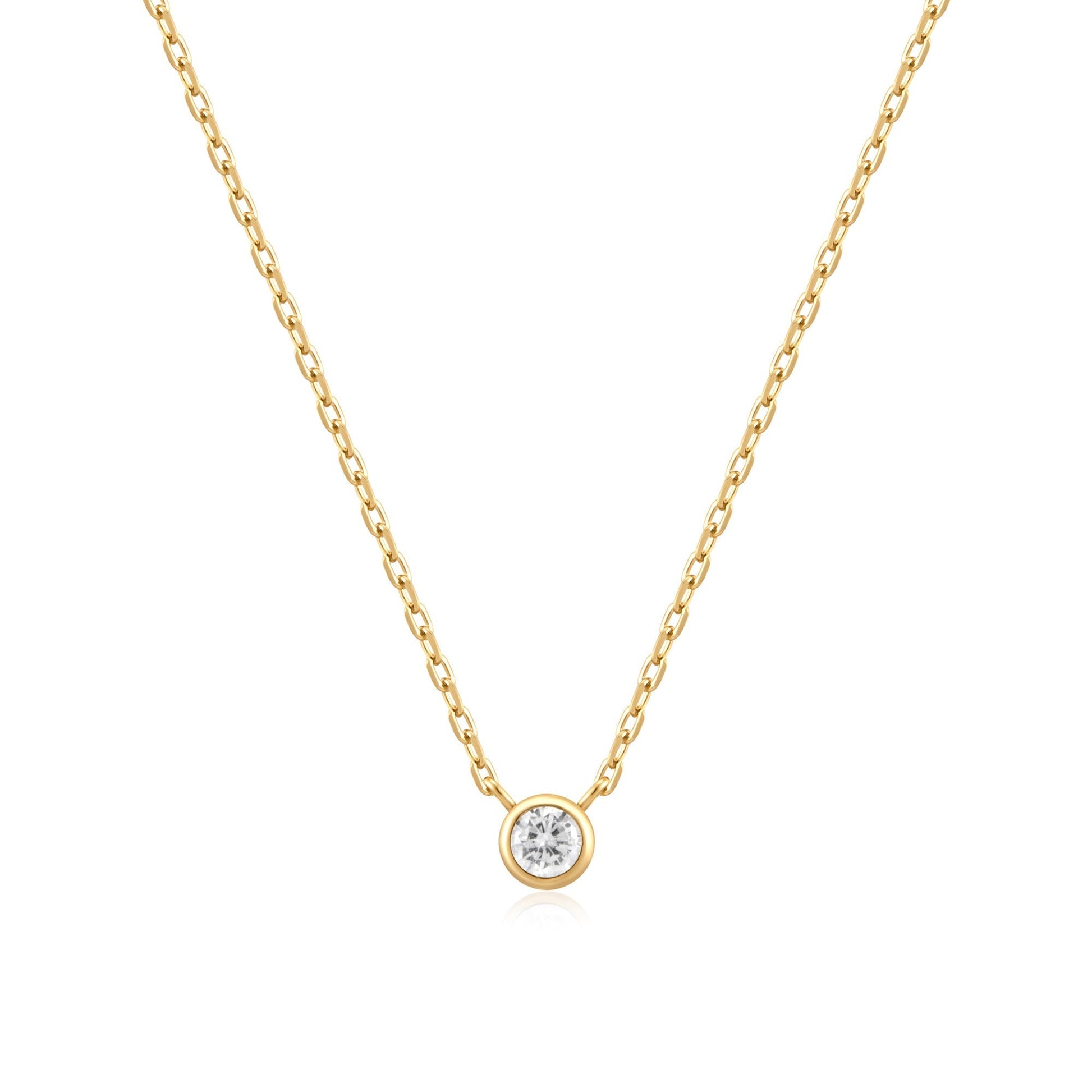 An elevated classic to add to your everyday jewellery rotation, this necklace is 14kt-plated gold sterling silver with a round cut cubic zirconia stone in a bezel setting. Stack it up with other chains or wear it alone, you will definitely refresh your daily styles.