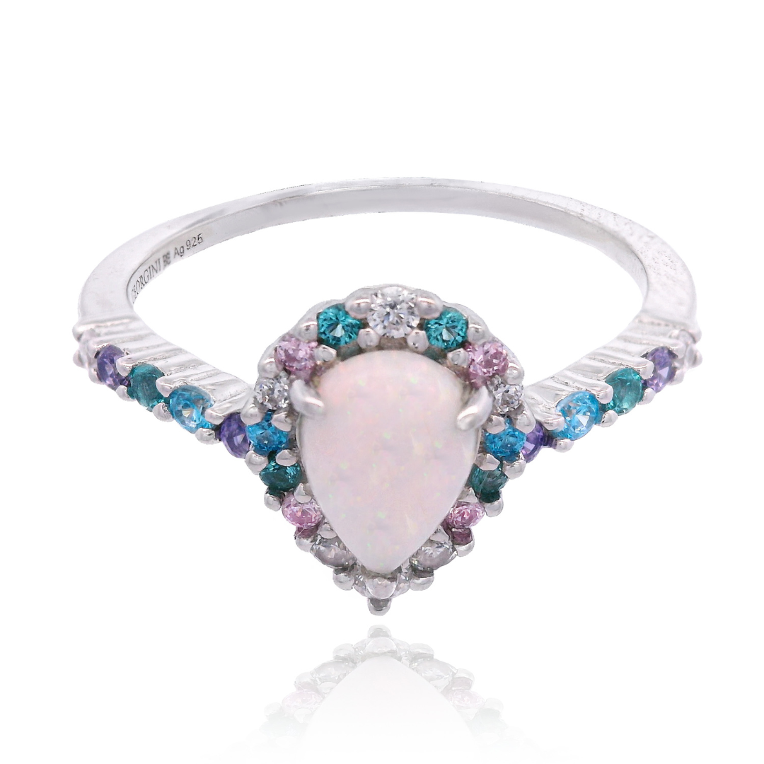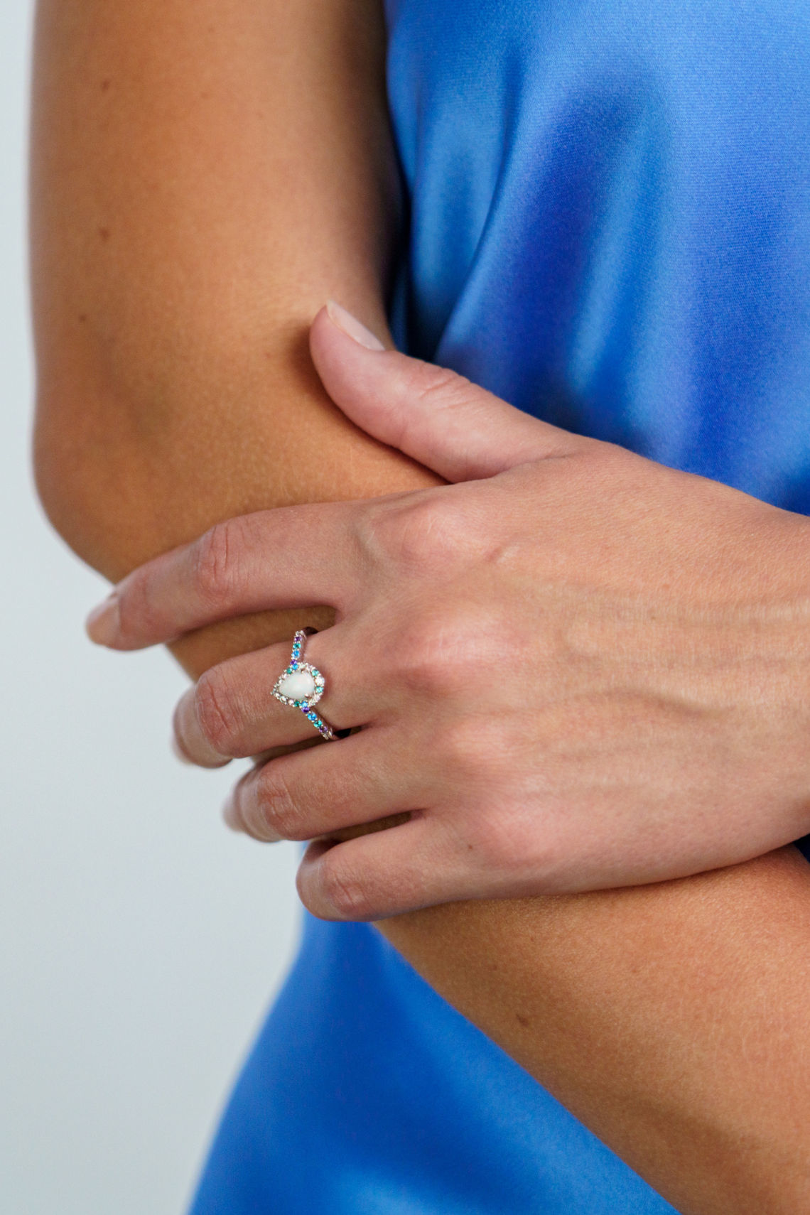 Surrounding the opal, a sparkling halo of soft, multi-coloured stones dances with every movement, creating a magical burst of colour and light. With its graceful design, this ring makes a refined statement while feeling effortlessly feminine.
