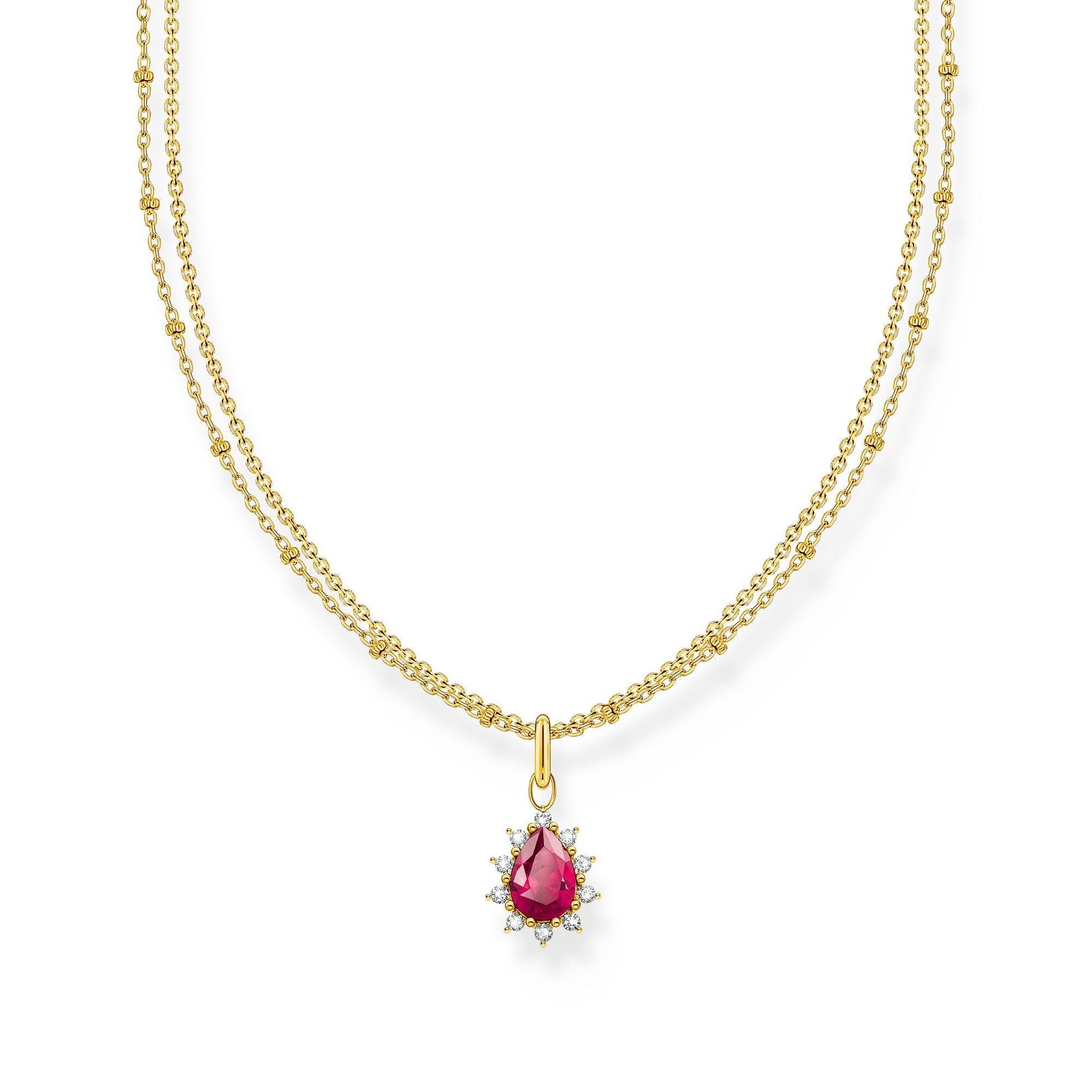 - Double-row necklace with a vintage-inspired pendant set with a drop-cut lab-grown sapphire red stone and small round-cut white zirconia stones